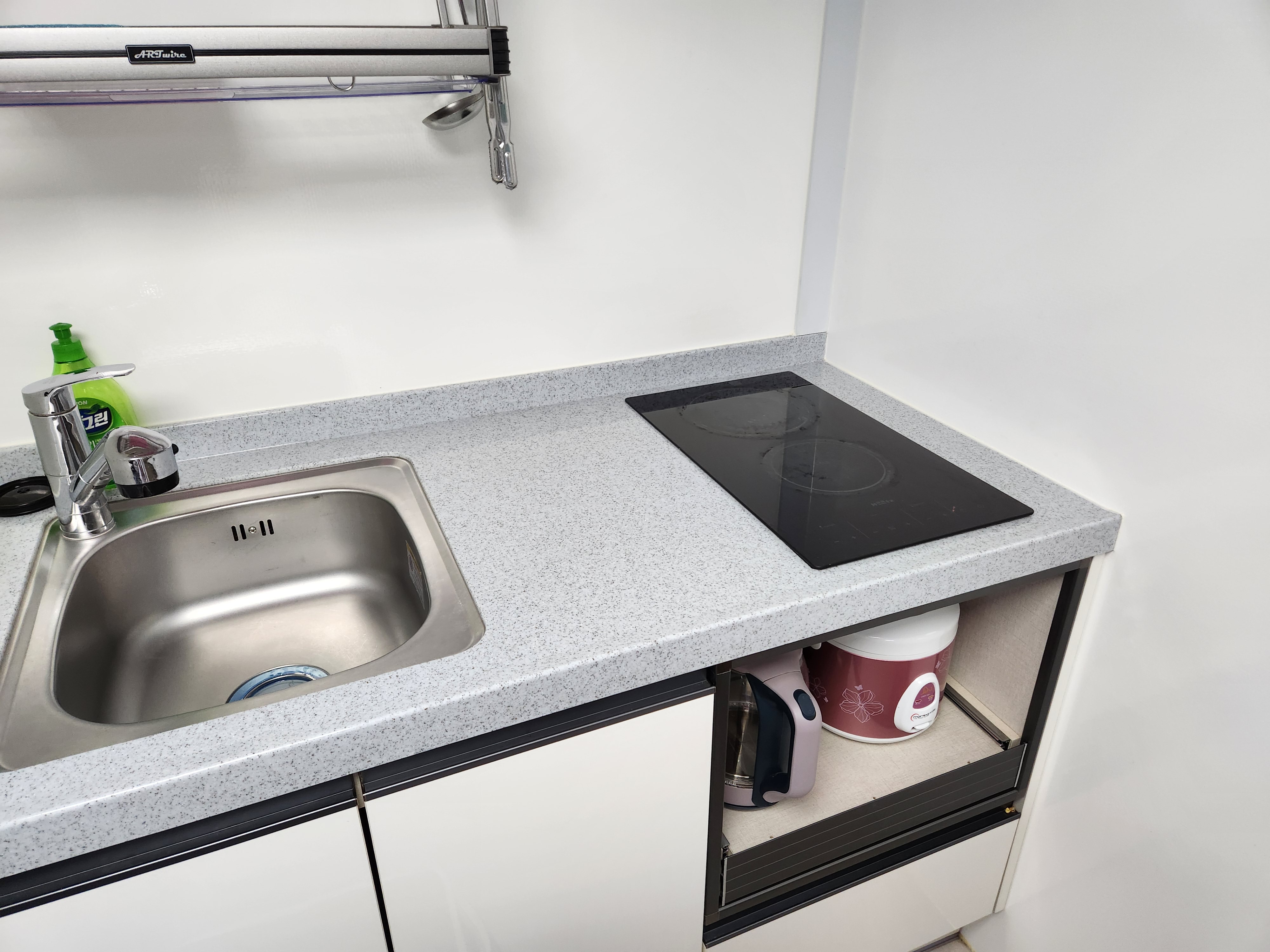냉장고 전자렌지, 그리고 하이라이트, 커피포트, 전기밥솥 있어 카라반 안에서도 간단한 요리 해 먹을 수 있는데요. 그리고 화장실도 샤워기 있고 깔끔했습니다.