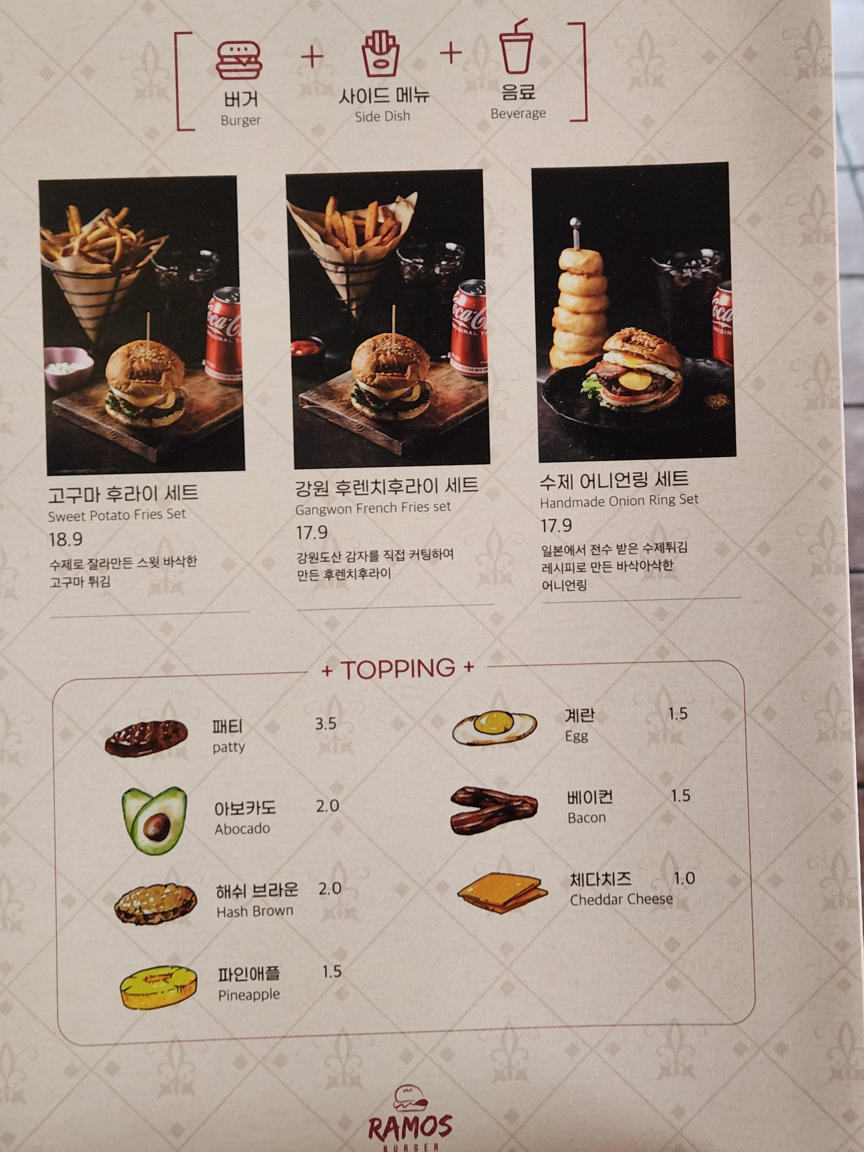 라모스버거 메뉴와 가격은 참조하시면 되고요. 저희는 뉴욕치즈의 여신, 나고야 버거, 키즈버거인 리틀라모스 있어 수제버거 3개 주문했습니다. 이중 뉴욕치즈의 여신 세트로 주문해서 음료와 사이드메뉴 수제 어니언링세트 같이 먹을 수 있었고요.