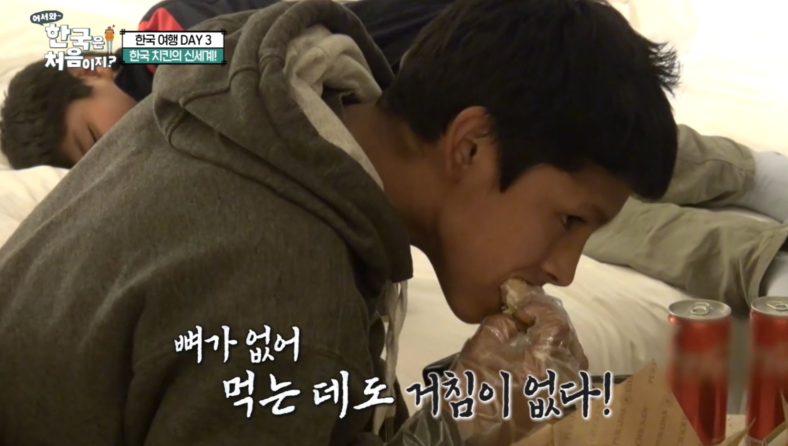신기해하면서 치킨 맛보는데요.
