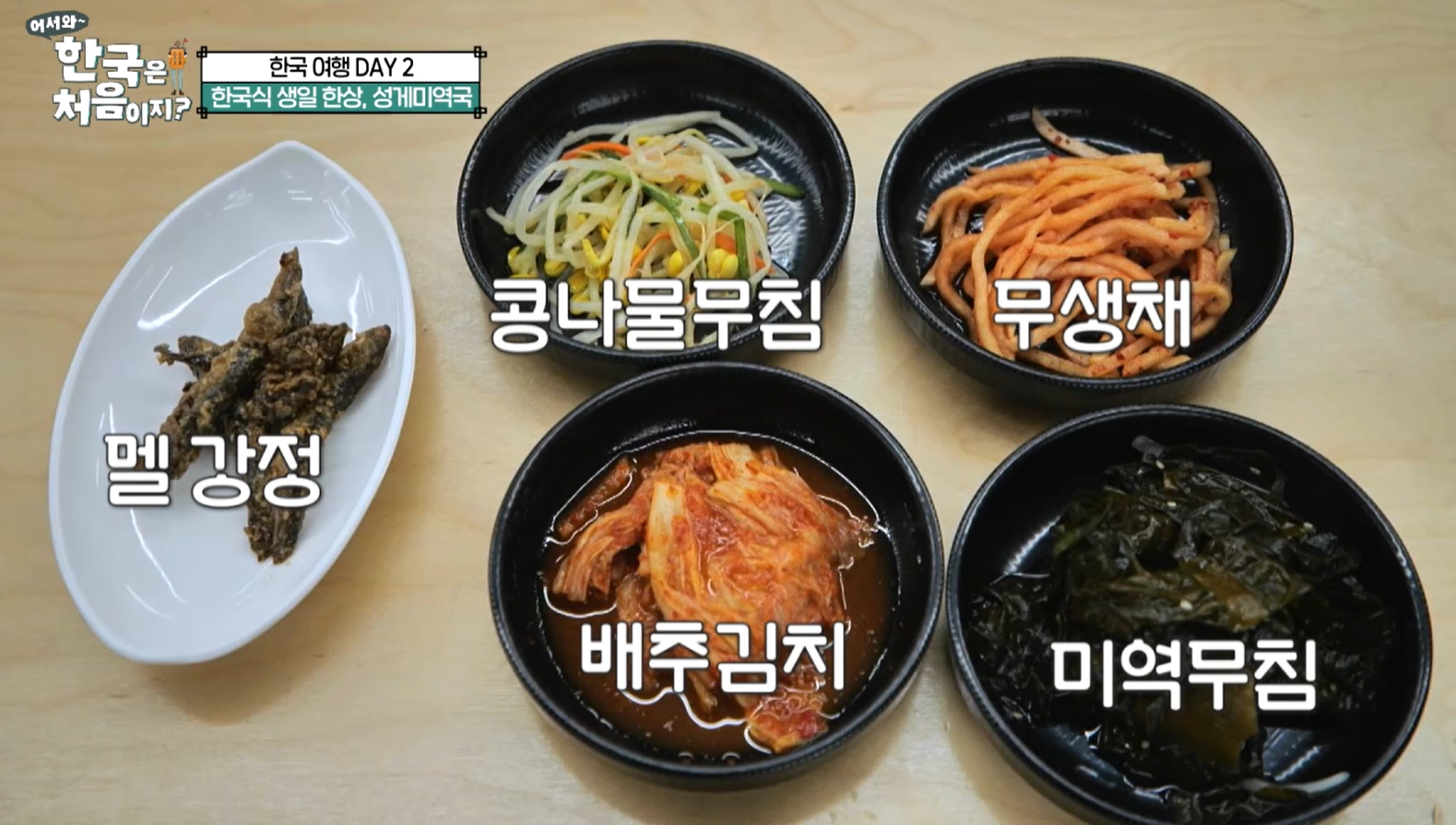 멜강정, 콩나물무침, 무생채, 배추김치, 미역무침, 고등어구이