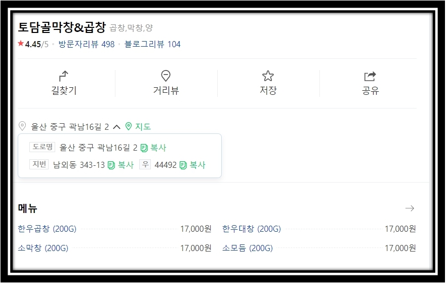 울산 중구 남외동 토담골 막창&곱창 입니다.